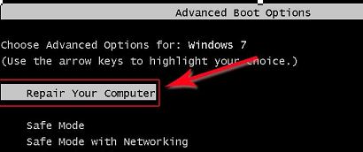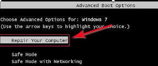 * Silakan Restart komputer, kemudian tekan tombol F8 beberapa kali, sehingga muncul advanced boot options, kemudian pilih Repair your computer.