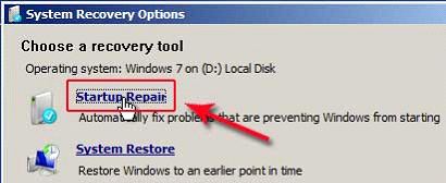 Note: jika dengan cara menekan tombol F8, tetapi tidak bisa masuk ke advanced boot options, maka anda bisa menggunakan CD/DVD instalasi windows. Dan tetap pilih Repair your computer, lalu pilih OS anda (jika OS tidak muncul), langsung klik Next. Akan muncul jendela Recovery Options dan pilih Startup Repair.